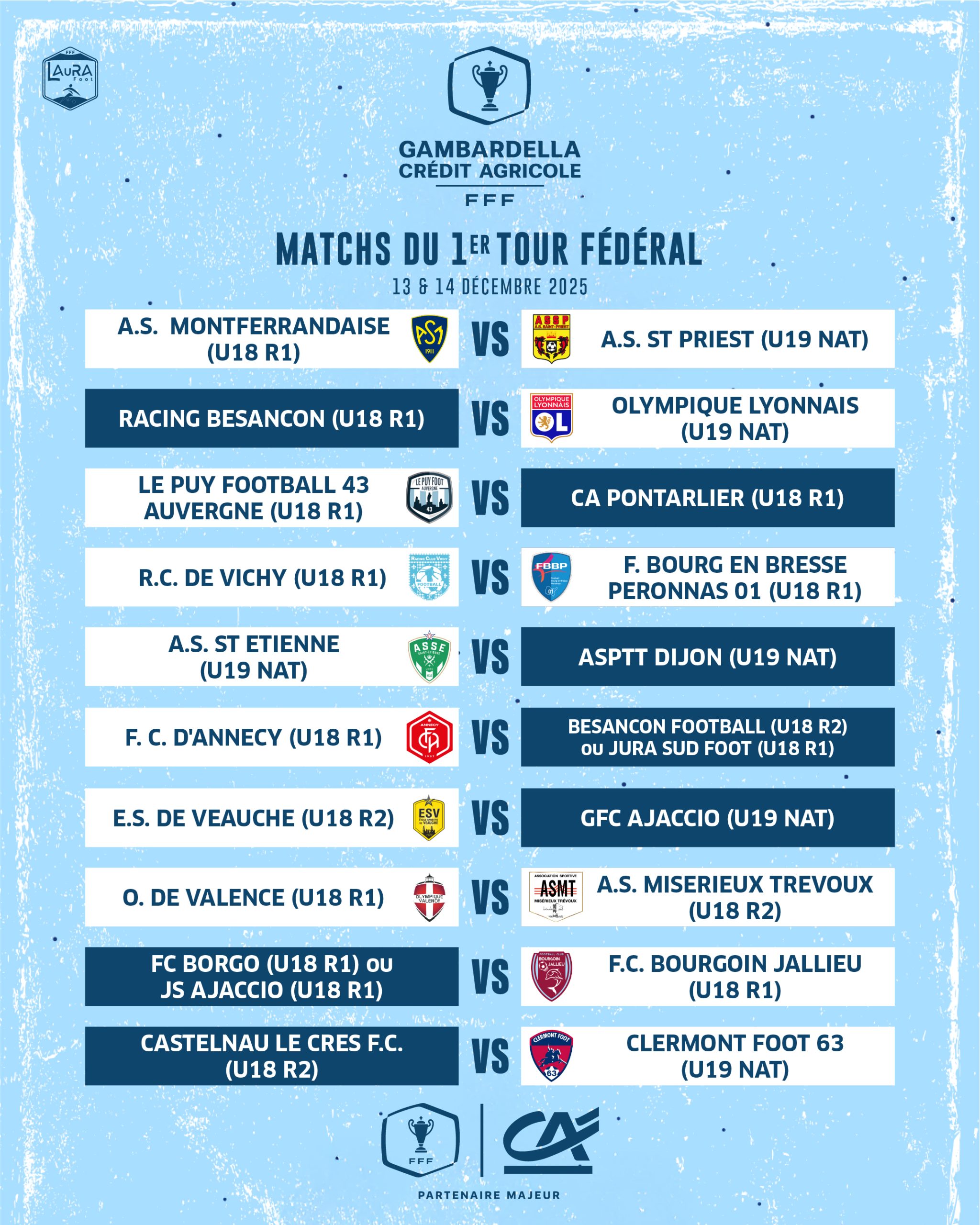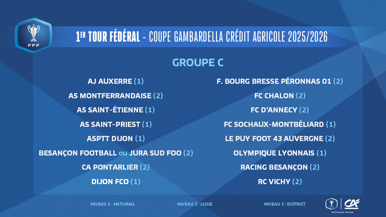 Le dernier tour régional passé, place au 1er tour fédéral et l’entrée dans la compétition des équipes de niveau national dont l’AS St Priest, l’AS St Etienne, le Clermont Foot 63 et l’Olympique Lyonnais. Le tirage au sort de ce premier tour fédéral a eu lieu ce jeudi 27 novembre 2025 au siège de la Fédération à Paris (12h00, en direct sur YouTube FFF).
