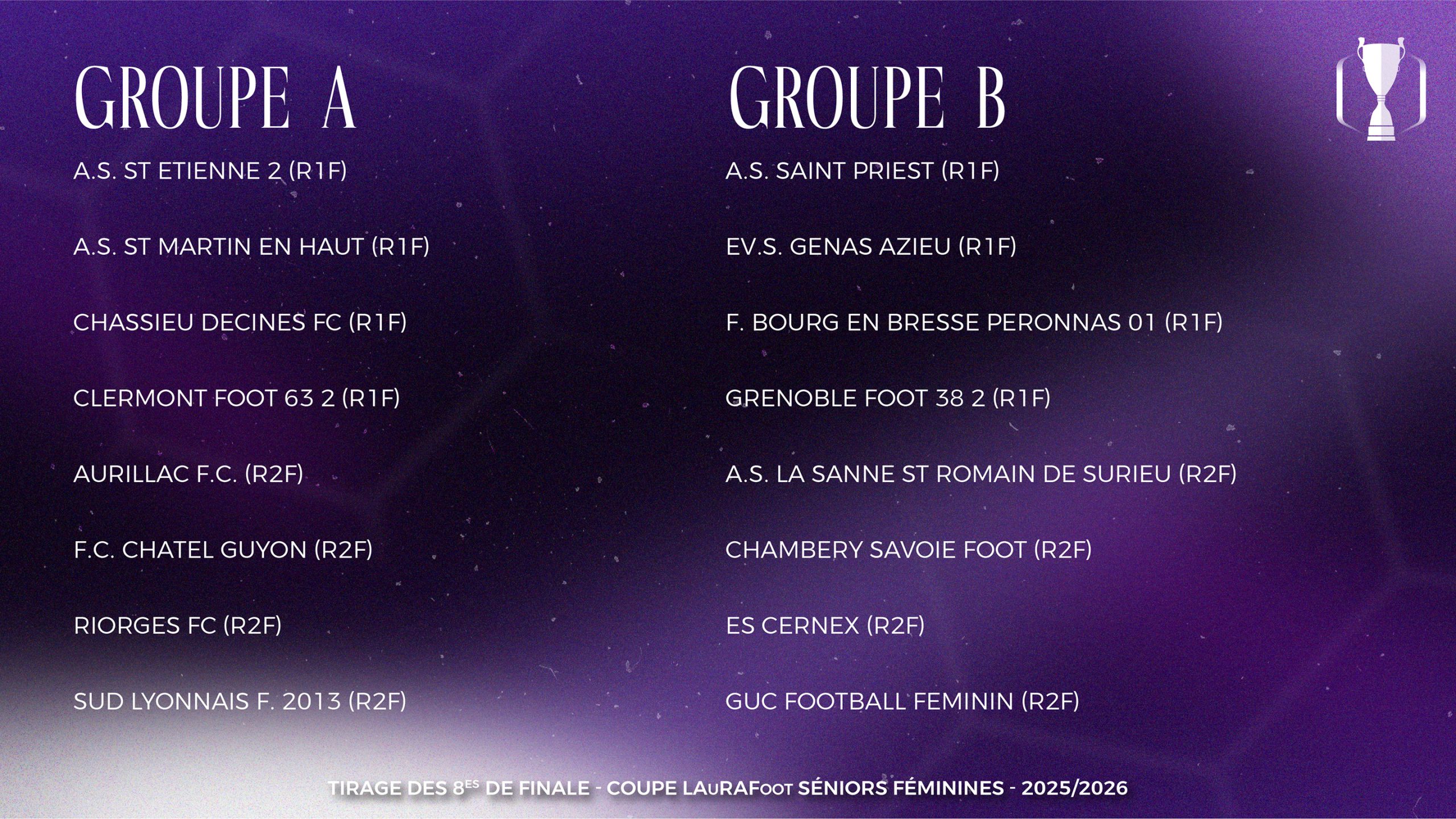 Les rencontres des 8es de finale de Coupe LAuRAFoot Séniors Féminines sont prévues le lundi 6 avril 2026 (Pâques).