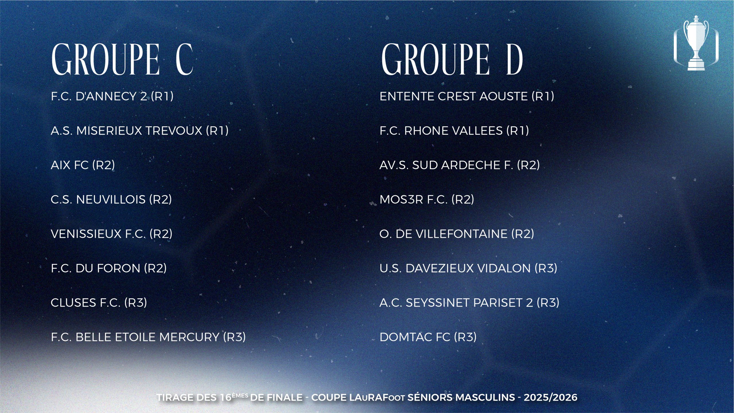 Les rencontres des 16es de finale de Coupe LAuRAFoot Séniors Masculins sont prévues le dimanche 15 mars 2026.
