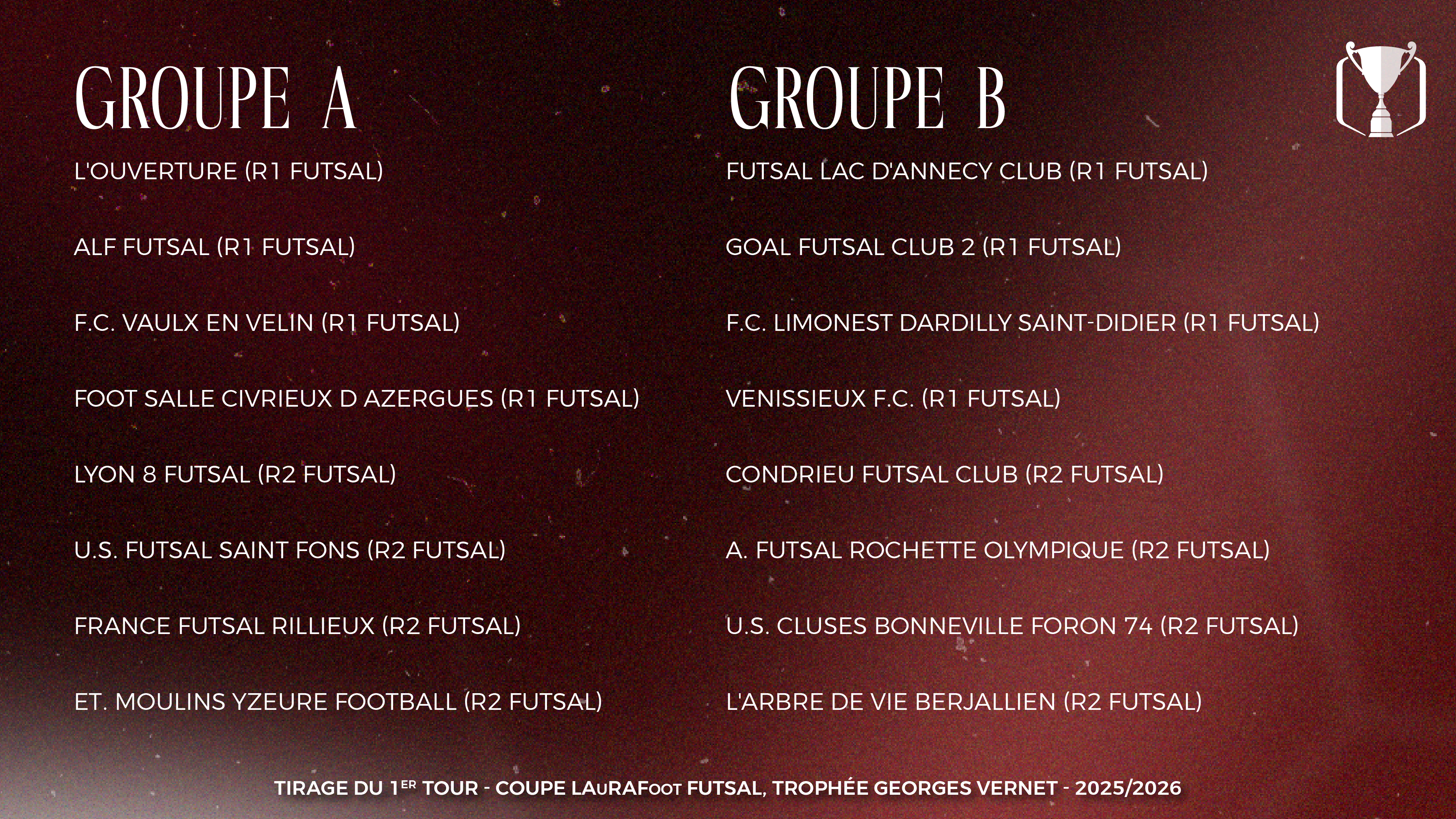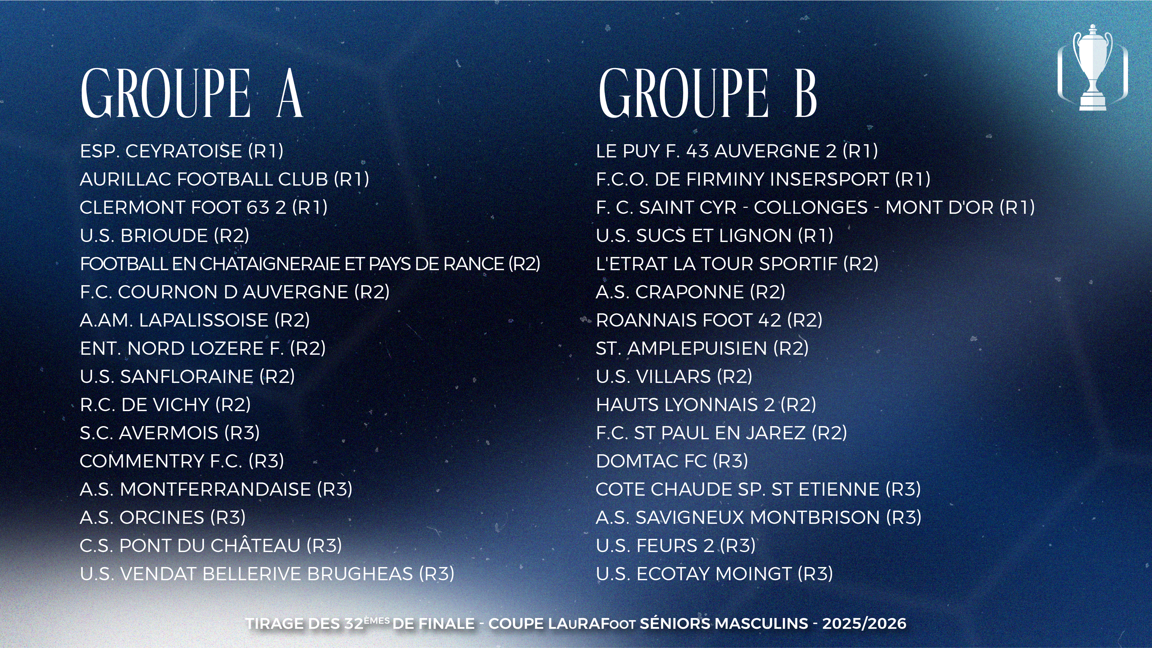 Suivez en direct le tirage au sort des prochains tours de Coupe LAuRAFoot Séniors Masculins (32es), Séniors Féminines (16es) et Futsal (8es) ce jeudi 15 janvier à partir de 18h00, à l’Établissement de la LAuRAFoot de Cournon d’Auvergne (63).