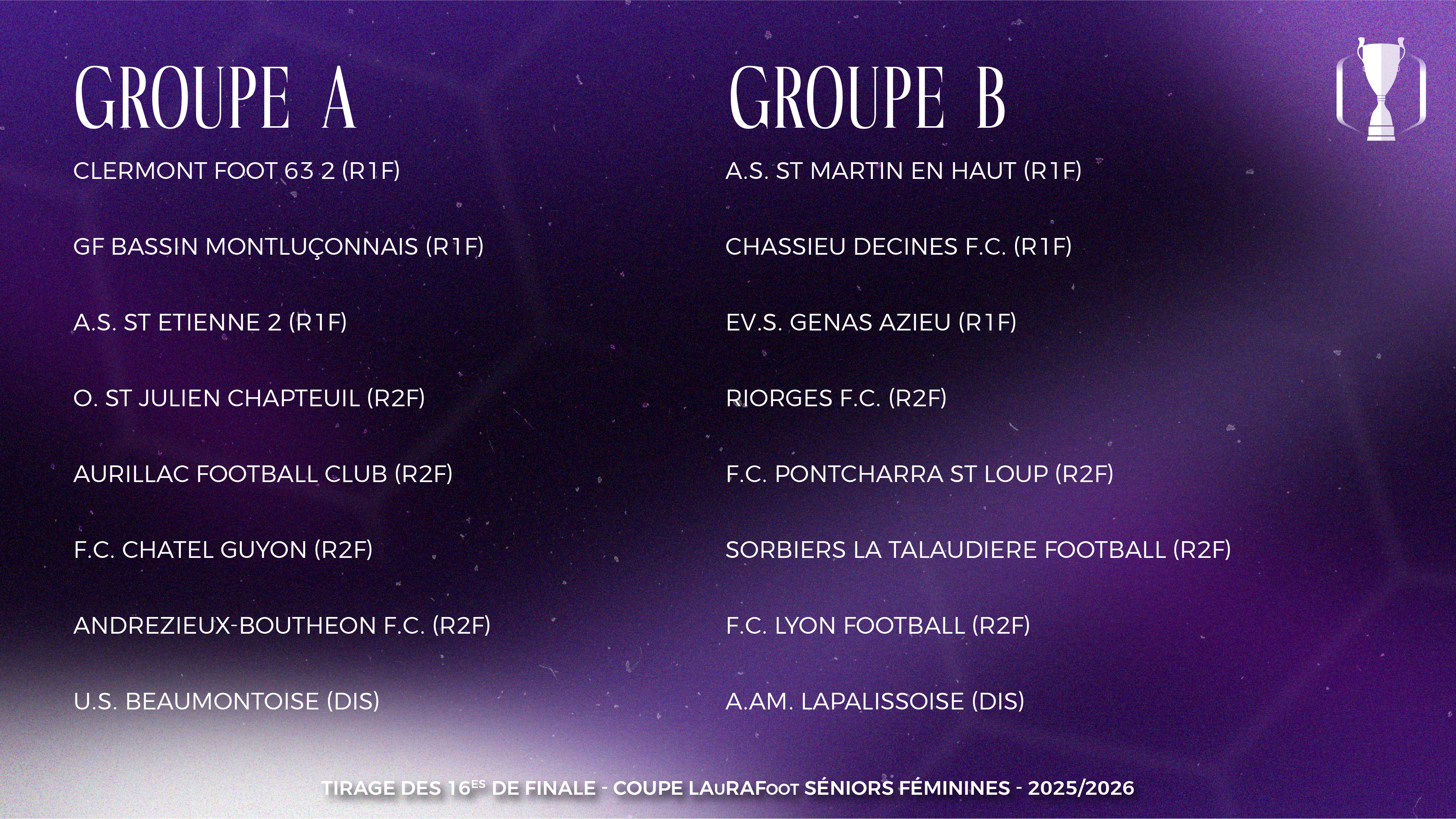 Les rencontres des 16es de finale de Coupe LAuRAFoot Séniors Féminines sont prévues le dimanche 8 février 2026.