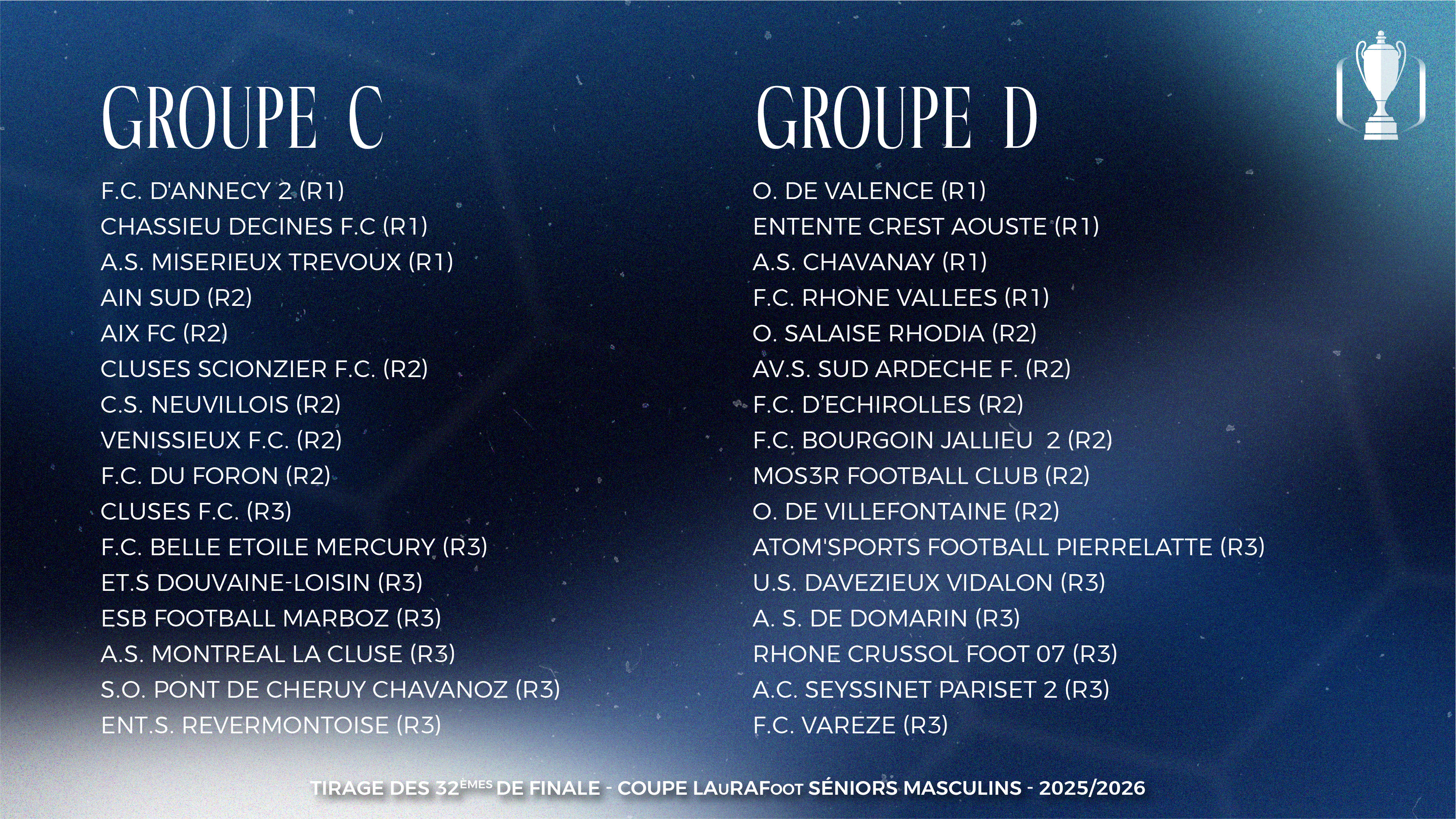 Les rencontres des 32es de finale de Coupe LAuRAFoot Séniors Masculins sont prévues le dimanche 15 février 2026.