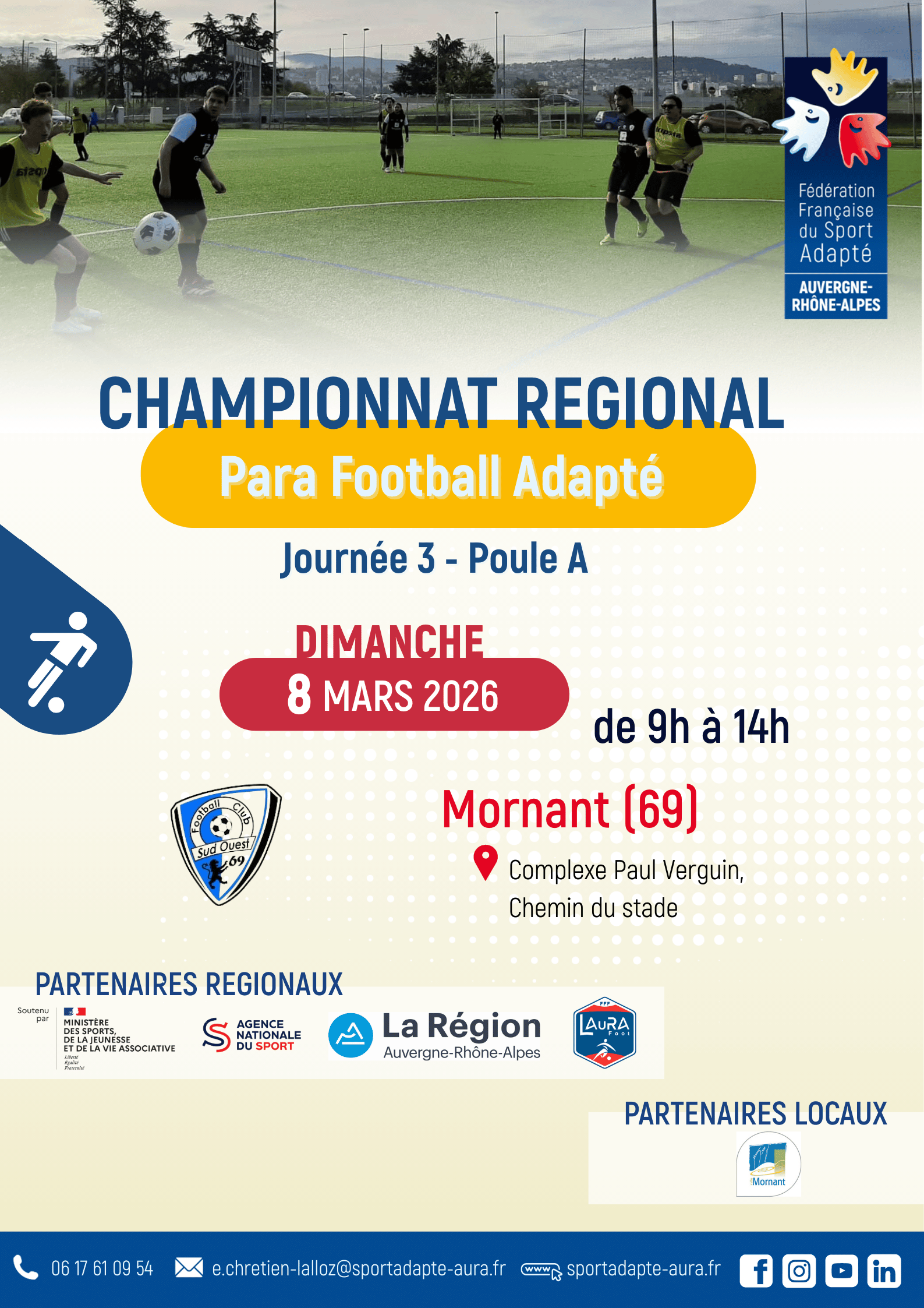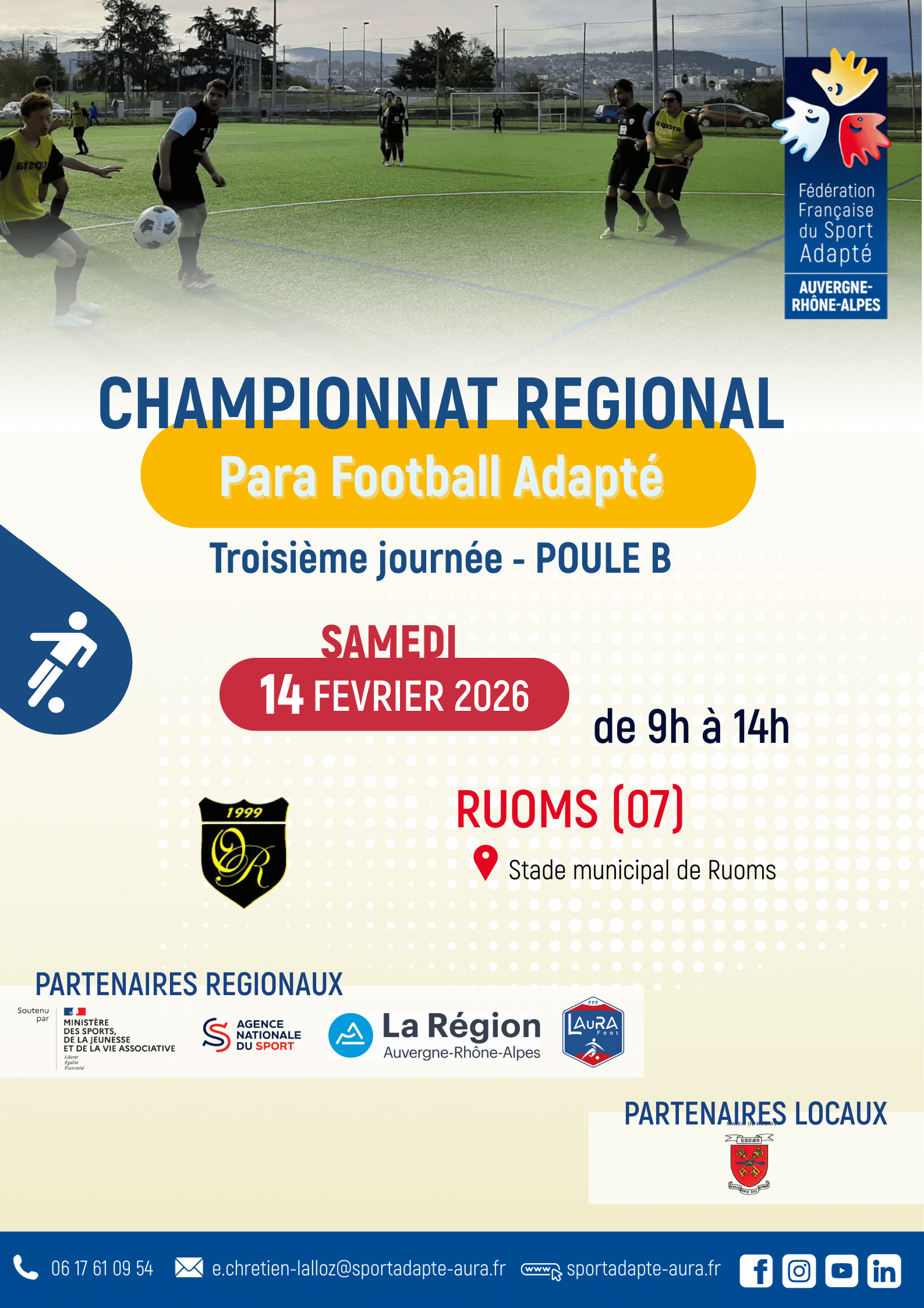 Les troisièmes journées du championnat régional Para Football Adapté auront lieu le samedi 14 février 2026 à Ruoms (Poule B) et le dimanche 8 mars à Mornant (Poule A).