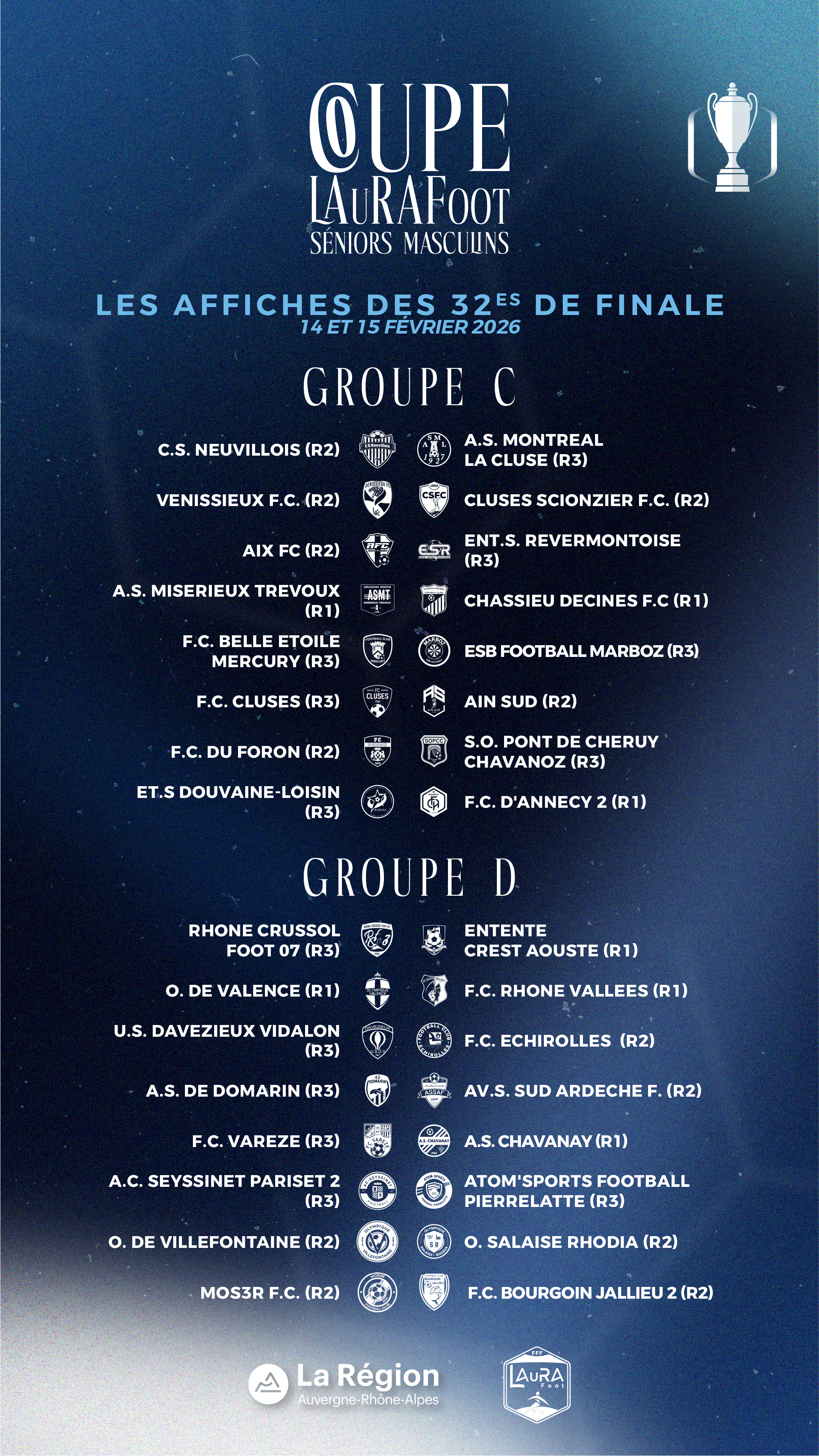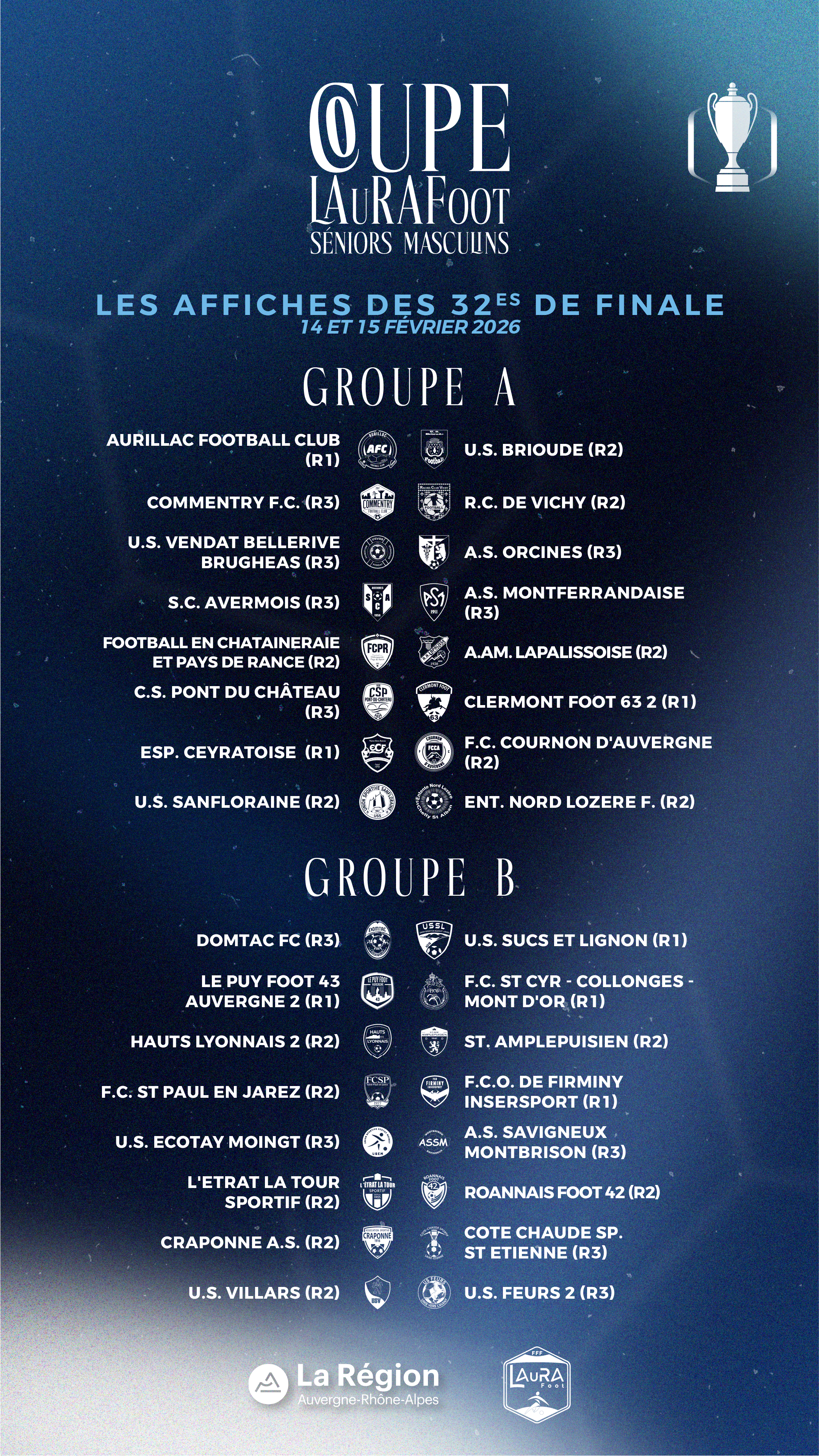 Les rencontres des 32es de finale de Coupe LAuRAFoot Séniors Masculins sont prévues le dimanche 15 février 2026.
