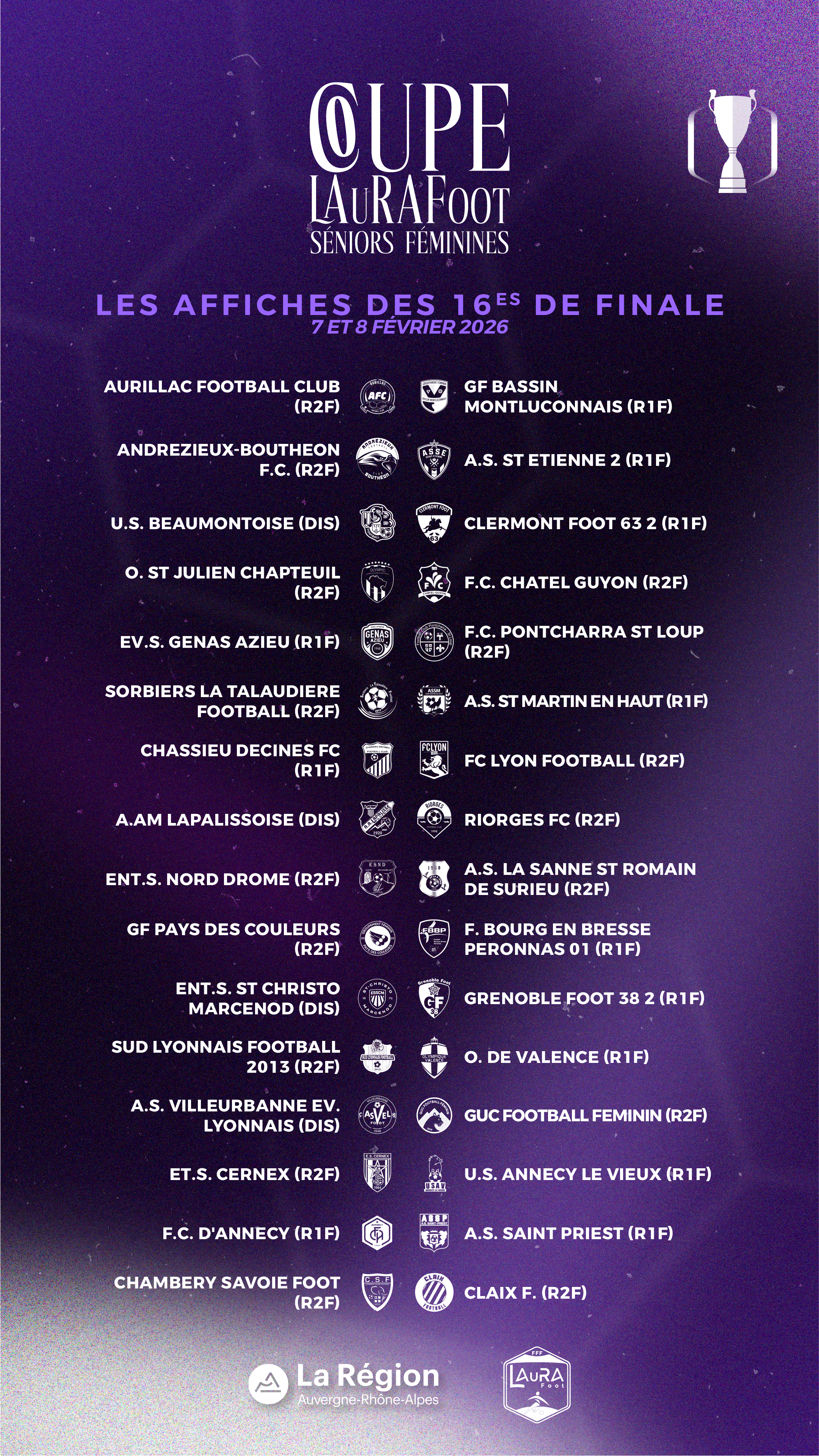 Les rencontres des 16es de finale de Coupe LAuRAFoot Séniors Féminines sont prévues le dimanche 8 février 2026.