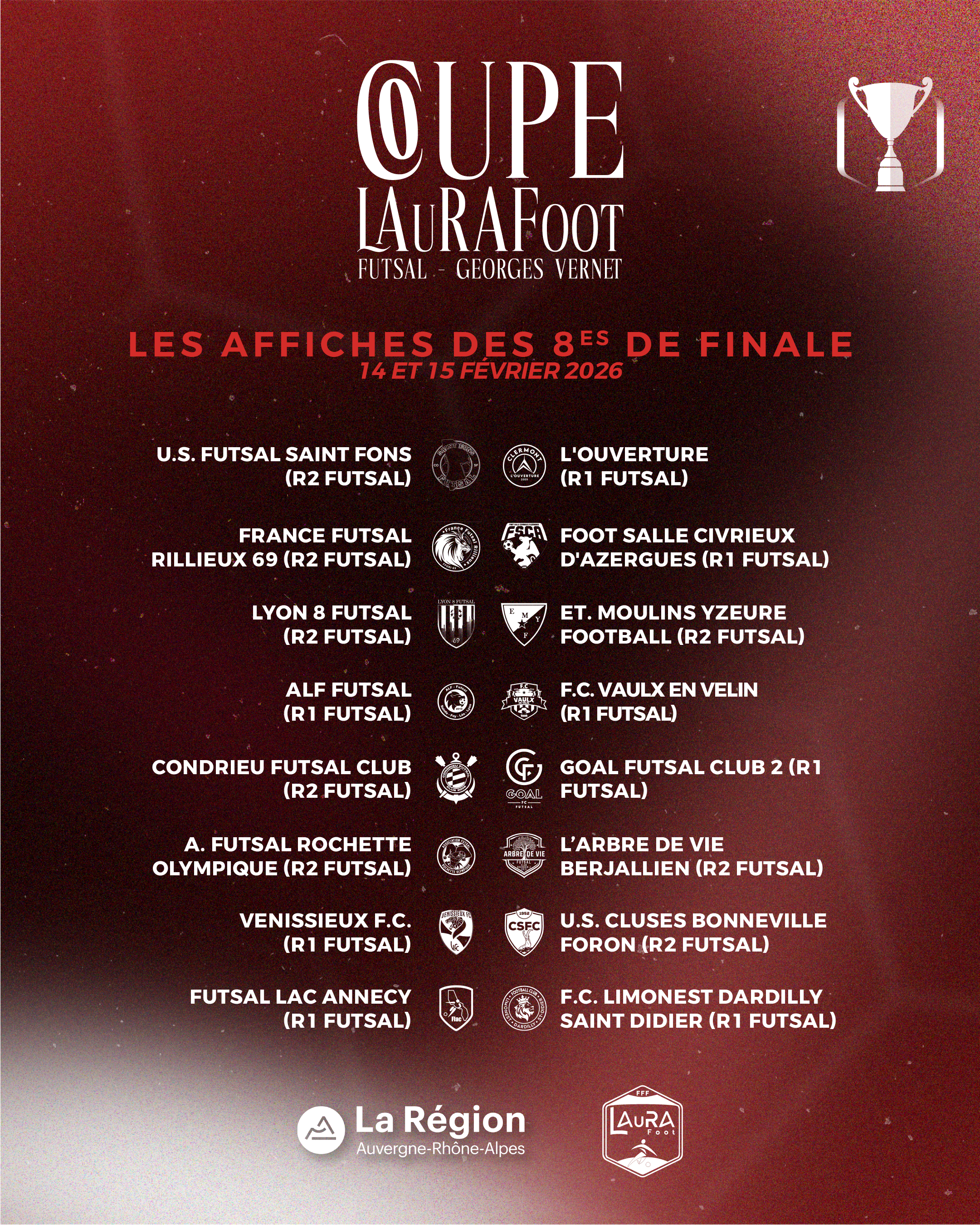 Les rencontres des 8es de finale de Coupe LAuRAFoot Futsal sont prévues le dimanche 15 février 2026.