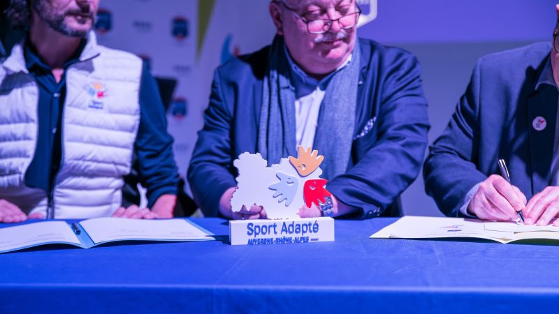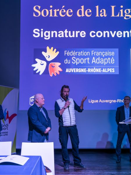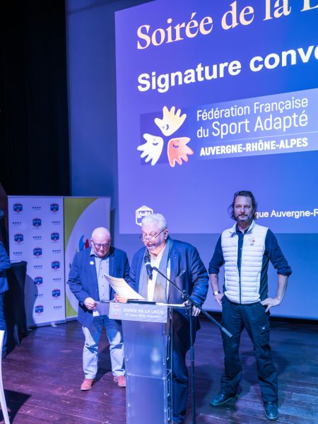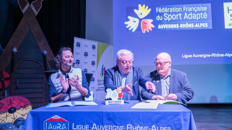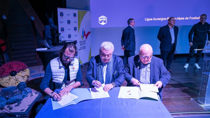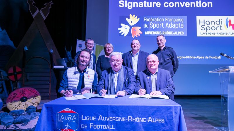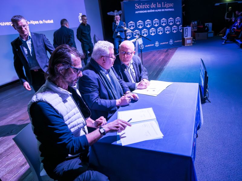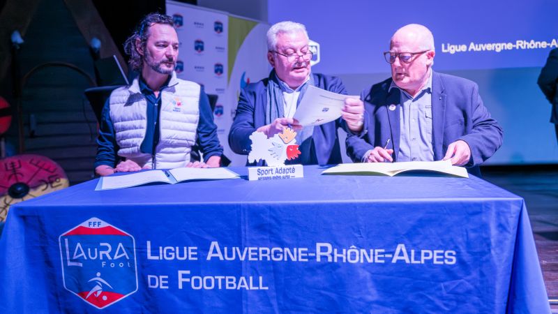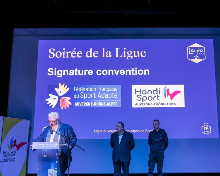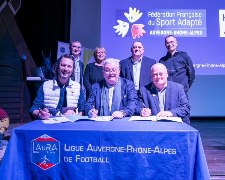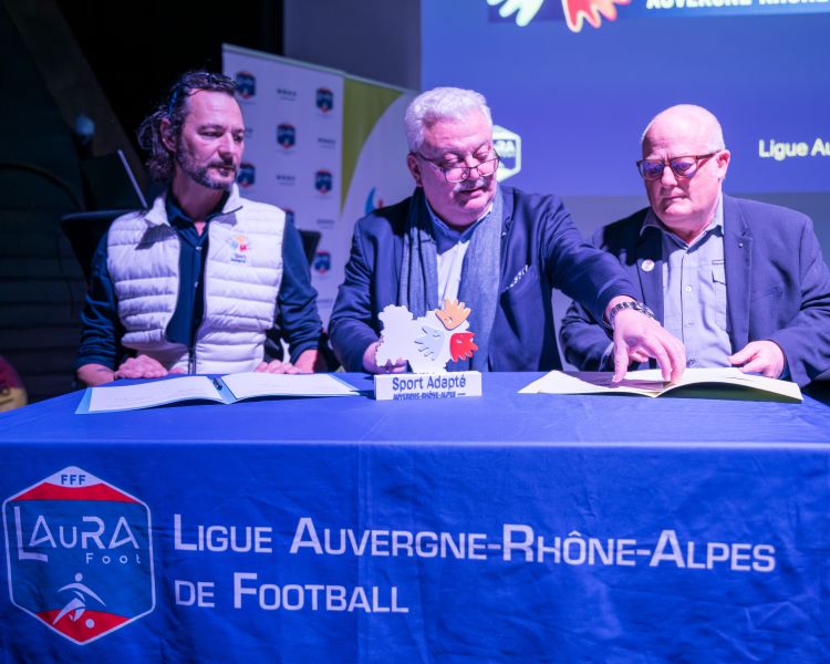 Dernier temps fort de ce rendez-vous, Pascal Parent, Président de la LAuRAFoot, membre du COMEX a procédé à la signature des conventions avec la Ligue du Sport Adapté, représentée par son Président, Jean-Michel Riehl et la Ligue Handisport représentée par son Vice-Président, Michel Berrier.